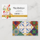 Tarjeta de visita perfecta para un chef, un comedor o un restaurante con verduras picadas que caen por un costado y textos e íconos totalmente personalizables, la parte trasera está adornada con un hermoso motivo de baldosas de Talavera mexicana. ¡personalizar esto para satisfacer sus necesidades! También podría ser genial para un blogger de comida para la salud, un chef vegetariano, consultor de comida para la salud, cocinero casero, dietista y más.