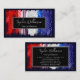 Esta elegante y glamurosa tarjeta de visita incluye pinceladas patrióticas rojas, blancas y azules con lentejuelas y purpurinas sobre un fondo negro. El texto combina el guión manuscrito y las fuentes sans serif modernas para un aspecto elegante y sofisticado. Es perfecto para maquilladores, esteticistas, spas, estilistas de moda, diseño interior y más.