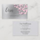 Esta tarjeta de visita profesional presenta ramas de flor de cerezo rosadas sobre un fondo de lámina plateada falsa y una caligrafía manuscrita grande para su nombre. Tarjeta de visita floral de lujo adecuada para artistas de maquillaje, spa, jardinería, planificadores de bodas, planificadores de eventos, cosmetólogos, salón de belleza...