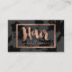Esta elegante plantilla de tarjeta de diseñador presenta un tratamiento de texto escrito a mano para "Cabello" seguido de su nombre o nombre de negocio para una hermosa identidad de marca en esta tarjeta de visita para los peinadores. Creado en un falso efecto de Relieve metalizado de oro rosa metálico con un patrón floral gris oscuro y negro en el fondo para añadir profundidad. Esta tarjeta de doble cara te permite tener una amplia habitación en la parte posterior para tu información de contacto. Este diseño forma parte de una serie de materiales de oficina de coordinación para ayudar a marcar su negocio de belleza. Arte y diseño © 1201AM Design Studio | www.1201am.com