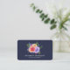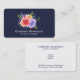 Tarjetas de visita con un bonito ramo de rosas acuarelas con estampados, hojas y ramas, todo ello en un colorido arreglo floral. Fondo azul marino.