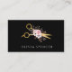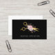 Esta distintiva tarjeta de visita para profesionales del pelo incluye unas elegantes tijeras de oro y un ramo de delicadas flores rosadas, situadas en un elegante fondo negro, creando una representación visualmente impresionante de su pericia y su talento.