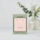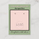Upload Your Logo in blush pink area, or delete sample placeholder to leave blank. Handmade Jewelry typography at top in blush. Name in blush pink against sage green background. Crafted with Love written in black script (keep or insert short tagline, or delete to leave area blank). Two Small Circles against blush and white framed background. NOTE: Circles are not pre-cut, you will need to use a small hole punch to make clean cut holes, to then place your Earrings in. Backside has small red heart. Insert telephone number, email address, website, social media handle, as needed. Insert Your Business Website QR Code for customers to Shop 24/7, or delete as needed. Original Design by TamiraZDesigns.
