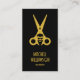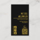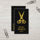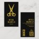Elegantes tarjetas de visita negras para peluqueros y peluqueros con tu nombre y moda en la parte delantera y más detalles en la parte trasera con tu información de medios sociales, dirección, número de teléfono y un código QR todo con letras doradas (no metálicas). Personaliza estas tarjetas para ser únicas.