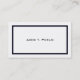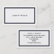 Una simple tarjeta de visita con una banda azul oscura que enmarca un fondo blanco y una impresión negra. Los detalles personalizados que desea incluir están en el reverso, que también tiene la banda azul oscuro, un fondo blanco y una impresión negra.