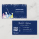 Una tarjeta de visita elegante y glamurosa sobre un fondo azul marino decorada con polvo falso purpurina plateado en el frente y equipo de limpieza. Personaliza y agrega tu nombre, información de contacto de texto y tu propio código QR a tu dirección de sitio web.