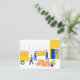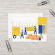 Tarjeta de visita de servicio móvil de apartamentos. Los trabajadores llevan cajas y sillones de apartamento en camión y las mujeres tienen gato en las manos. Traslado, negocio de servicios de entrega, servicios de mudanza, mudándose a un nuevo lugar. Tarjeta de presentación de ilustracion personalizado plano brillante.