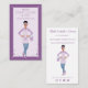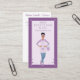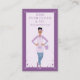 Tarjeta de presentación de servicios de limpieza modernos y profesionales que incluye a una hermosa mujer hispana sonriente y amable con las manos en la cadera y un cubo de agua jabonosa y burbujas. La señora lleva un delantal a rayas violeta-púrpura con una camisa lavanda y jeans de mezclilla. Diseño de marco morado de dos tonos con marco de corazón y acentos brillantes. Personalice con el nombre de su negocio, sitio web y monograma que se coloca en el bolsillo del delantal. El reverso presenta a la hermosa dama. Personalice con su nombre, título, información de contacto y nombre de usuario en redes sociales. Todas las ilustraciones son obras de arte originales hechas a mano por Moodthology Papery.