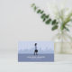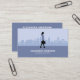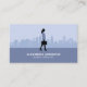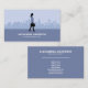Una tarjeta de visita con una silueta de una mujer con un maletín sobre un fondo compuesto por un perfil urbano con algunos edificios. La parte posterior tiene información de contacto completa. Perfecto para actividades como consultor de negocios, contable, servicios fiscales, gestor de inversiones, analista, etc.
