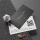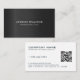 Modern black metallic business card with customizable gray text on carbon fiber background. Simple design with QR Code on white reverse side.