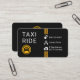 A black cover is accentuated by a pair of vertical yellow lines that contain buttons to hold your contact details. In the opposite direction is the oversize business name "TAXI RIDE" which you can change and a yellow taxi car logo you can use.