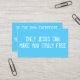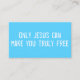 Una moderna tipografía fresca Mensaje cristiano de esperanza y fe y buenas noticias en una tarjeta de visita estándar que se puede usar como herramienta de alcance para repartir y difundir el evangelio El frente de la tarjeta dice: Sólo Jesús te hace verdaderamente libre con letras blancas angustiadas en azul claro con un verso relevante de la Biblia en la espalda que dice: Si el Hijo te hace libre, entonces seréis libres. John 8:36 KJV