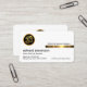 A retro white cover is accentuated by a faux gold stripe near the right side of the card. Riding this gold stripe of success is your business name with a creative gold "letter-e" logo you can use in the opposite direction. The letter-e can represent "electrician" or possibly your business name. Below the logo is your prestigious name, job title and the contact details with a slogan caption in the opposite direction.