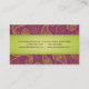 Una mirada exótica que conseguirá la atención en cualquier oportunidad del establecimiento de una red. La verde lima Paisley diseña contra púrpura rica compone el fondo de esta tarjeta de visita. La información de contacto imprime contra una banda verde clara de la pendiente en el frente y la parte posterior. Un suntuoso busca la materia textil o los interioristas, los coordinadores del acontecimiento o las tiendas al por menor. Disponible en colores alternos con los productos a juego.