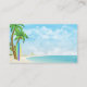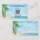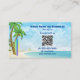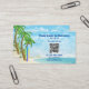 Esta tarjeta de visita con código QR incluye una tabla de surf en una playa tropical con palmeras. El agua es azul y hay nubes dispersas por el cielo. - cerca del Beach Bum