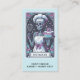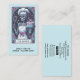 A unique Tarot themed baker, pastry chef business card featuring a skeleton with cake and whisk. A unique style with skeleton baker in chef's hat. Blue and pink hues.