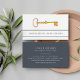 Las elegantes tarjetas de visita para las empresas de venta en casa o los decoradores de interiores cuentan con un ilustracion con una llave de color de agua con su nombre o nombre de negocio debajo. Añade tus datos de contacto completos al reverso en blanco sobre un fondo azul humeante que contrasta.