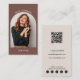 Un hermoso diseño de arco de Terracota que incorpora 1 de sus propias fotos y su código QR. Esta minimalista tarjeta de negocios de Terracota y beige es ideal para todo el mundo. Una forma sencilla y profesional de presentar tu negocio. Marcadores de posición de iconos de medios sociales incluidos en el diseño de esta tarjeta de visita para que los reemplace con sus íconos de medios sociales. Personalice sus detalles para crear su propia tarjeta de visita única en blanco y negro. Una tarjeta de visita perfecta para fotografía.