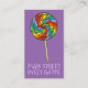 Simplemente personaliza con tu información para un aspecto único. Las tarjetas de visita cuentan con un ilustracion de marca original de un lollipop arcoiris, impreso en un fondo morado. ¡Genial para una tienda de dulces!