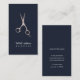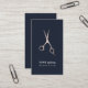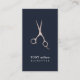 Plantilla de tarjeta de presentación personalizable elegante con tijeras de metal FAUX y fondo azul oscuro. Perfecto para estilistas de cabello, salones de belleza.