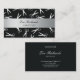 Tarjeta de visita estilista en negro y plata azul. Un patrón de tijeras de plata contra un fondo negro, con una etiqueta de plata con tu nombre y título.