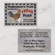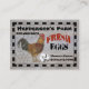 Un diseño de estilo rústico, con una imagen de un pollo a la izquierda con alambre de pollo detrás, siete hermosos huevos blancos bajo el texto negro y rojo "HUEVOS FRESCOS DE GRANJA". En el exterior hay un borde de cuadros negros, todo ello sobre un tablero de madera templado. Personalice la parte delantera y trasera de estos huevos frescos, tarjetas de visita de granja de pollos con su nombre de granja, número de teléfono y horario de trabajo en la parte delantera de la tarjeta y su nombre, dirección, sitio web y cualquier palabra que desee en la parte posterior.
