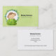 Tarjetas de visita con un ilustracion de un pequeño mono mirando por detrás de un arbusto verde. Rodeado por una corona de hojas tropicales. Colocado en un fondo de color verde.