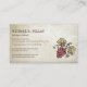 La plantilla de tarjetas de visita artística relacionada con la bodega incluye una imagen pintada a mano de una cesta de uvas, dos botellas de vino y vasos de vino y un espacio de apertura de vinos en un tablero de madera de granero vintage. Las imágenes, tanto en la parte frontal como en la posterior, se pueden cambiar de tamaño, mover o borrar. Por favor, puede personalizarlo con su propia información o personalizar si necesita cambiar el texto, la disposición del texto, el tipo de letra, el color del tipo de letra, el tamaño del tipo de letra o el tamaño de la tarjeta de visita. También se puede usar para su boda de viñedos y bodegas.