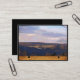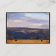 Esta colorida tarjeta de comercio artístico ofrece unas vistas maravillosas de una colina lejana con una pequeña granja. El espectador está parado en un campo de heno dorado con algunas balas cerca. El cielo parcialmente nublado es agradable, con colores pastel: azul, rosa, amarillo, malva, violeta y blanco. Todo está sumergido con una luz luminosa.