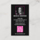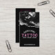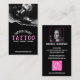 Features white modern and pink decorative text for business name, services offered and website with image on the front. White modern text for your name, phone number, address and personal contacts with QR code and personal photo on the back, all on a black background color. Perfect for tattooists or other small business owners.