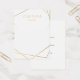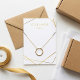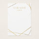 Una sencilla y moderna tarjeta de visualización de collar o pulsera cuenta con un fondo blanco nítido con líneas geométricas de efecto oro refinadas y un nombre de tienda editable, además de unos marcadores impresos sutiles que orientan el ajuste o la colocación. Lo inverso incluye iconos coordinados de oro en medios sociales con espacio para asas, lo que facilita que los clientes sigan, etiqueten y revisen después de la compra mientras mantienen el diseño limpio y profesional. Los colores, las fuentes, el texto y el tamaño son totalmente personalizables para que coincidan con el estilo de la marca. Los marcadores de posicionamiento y el tono dorado son efectos impresos.
