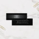 Tarjeta mini de visualización de producto de color negro o personalizado con un gradiente gris oscuro, plantilla de logotipo personalizado centrado e iconos de medios sociales. Se pueden ajustar las guías de asignación agregando y eliminando espacios en el campo de plantilla y moviendo todo el elemento en la herramienta de personalización.