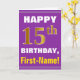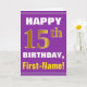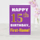 Las características del este de felicitación diseño cumpleaños-temáticas simples de la tarjeta un deseo caliente del cumpleaños tienen gusto del "décimo quinto CUMPLEAÑOS FELIZ, Primero-Nombre!" en el frente, en texto intrépido en una púrpura coloreó el fondo. El número del cumpleaños tiene un falso/una imitación oro-como aspecto del colorante. El nombre en el frente puede ser personalizado. Las características interiores un mensaje del cumpleaños que puede ser personalizado. Una tarjeta de felicitación como esto podría ser una manera de la diversión de entregar deseos del cumpleaños alguien que está celebrando su décimo quinto cumpleaños. [~Z0000277]
