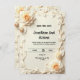 Una tarjeta de bonito diseño, adornada con rosas delicadamente grabado en relieve o en 3D, de un blanco suave y color marfil, con un delicado fondo crema, desprende un toque de lujo y sofisticación. Los pétalos y hojas delicados de los rosas destacan, añadiendo un toque delicado a la superficie de la tarjeta. El conjunto desprende romanticismo y elegancia, con un escudo sutil que capta la luz. La superficie de la tarjeta es lisa hasta el tacto, con una textura clara en las zonas grabado en relieve, motivadora al receptor a correr sus dedos sobre el diseño intrincado. El diseño es equilibrado y simétrico, los rosas están dispuestos en un estilo orgánico de forma libre que le da a la tarjeta un toque encantador y artesanal.