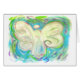 Pintura de un ángel en blanco con remolinos suaves del color. El ángel flota sobre un fondo tranquilo del verde y suavemente del azul de la espuma del mar. ¡La tarjeta puede ser personalizada!