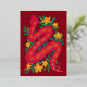 Una serpiente ilustrada de color rojo y rosa, detalles de flores amarillas doradas y texto de lámina de oro metálico real dan a esta tarjeta de año nuevo chino brillo y envía deseos para un año nuevo lunar próspero y hermoso.