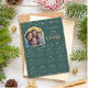 Calendario magnético con fotos y saludos de Navidades. Presenta su foto seleccionada junto con un saludo personalizado y el calendario 2026 en un fondo verde de copos de nieve en invierno.