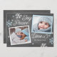 Esta tarjeta moderna del día de fiesta de 2 fotos ofrece alegría, paz y amor con los copos de nieve dibujados mano en un falso fondo de la pizarra. Añada un mensaje personalizado a la parte posterior para hacerle sus los propios. Seleccione una forma cortada con tintas o texturizó el papel para un tacto especial adicional.