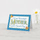 Tarjeta de saludo del Día de la Madre de bonito, con las letras llenas de un patrón de daffodils dorados, de un diseño acuarela pintado a mano por Judy Adamson, con puntos de polka blancos sobre azul profundo. Parte de la colección "Daffy-down-Dillies", de Posh & Painterly.