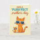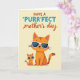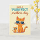 Esta tarjeta muestra dos gatos estilizados centrados en un fondo amarillo suave y cremoso, posando cerca uno del otro de una manera que sugiere un vínculo afectuoso ❤️. El gato más grande se sienta erguido con pelaje naranja y rayas marrones cálidas, mientras que el gato más pequeño refleja la pose justo a su izquierda, inclinándose hacia el momento compartido como un compañero de confianza. Ambos llevan gafas de sol blancas y elegantes, lo que añade una actitud amistosa y relajada que se siente como un chiste interno entre ellos. Cerca de la parte superior, la línea principal de texto está dispuesta en dos estilos, con la palabra “PURR” destacada en azul verde brillante para un énfasis ligero. El resto de la frase aparece en una letra rojiza y marrón que fluye, con “día de la madre” puesto en un tipo más pequeño debajo, manteniendo el enfoque en los gatos de abajo 🌼. La disposición se siente equilibrada, con un espacio generoso alrededor de las figuras para que sus expresiones tranquilas y cercanía transmitan el estado de ánimo. La sombra sutil y las formas suaves y simplificadas dan a la ilustración un aspecto moderno y pulido sin distraer del tierno empare