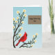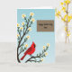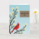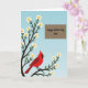 Diseñado con una suave escena primaveral, la tarjeta muestra un árbol robusto con ramas oscuras que se extienden hacia arriba en el lado izquierdo, salpicadas de pequeñas flores blancas con centros amarillos 🌼. Contra un suave cielo azul que se desvanece de tonos más oscuros a más claros, un pájaro rojo brillante con una marca negra en la cara y un pico naranja descansa en una rama inferior, inclinado como si se detuviera a cuidar a alguien con cuidado tranquilo ❤️. Las flores se agrupan alrededor del pájaro, dando al momento un sentimiento tierno y de compañía, como una pausa tranquila compartida entre seres queridos. En la zona superior derecha, un rectángulo marrón ordenado crea un espacio claro para el mensaje sin abarrotar la obra de arte. El texto dice “Happy Mother’s Day Omi”, escrito en letras suaves y fluidas en un color claro que se destaca contra el panel marrón. La disposición mantiene al árbol y al pájaro como el foco principal mientras que el mensaje se sitúa cómodamente a un lado. Las plumas carmesí del pájaro y los pétalos pálidos de las flores contrastan suavemente con el cielo de gradiente fresco y el panel de