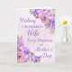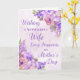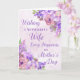 Tarjeta del Día de la Madre para esposa con hermosas flores de acuarela moradas y verso sentimental.