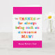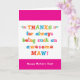 Llamas a tu abuela Maw, no a la abuela. ¡Imaginen lo emocionado que estará Maw al recibir una tarjeta del Día de la Madre dirigida especialmente a ella! A tu maw también le encantará el divertido y colorido diseño basado en textos de esta tarjeta del Día de la Madre que dice "¡Gracias por ser siempre un Maw tan impresionante! ¡Feliz Día de la Madre!" ¡Haz personalizable esta carta! Haga clic en "Editar diseño", "Inferior/Derecha: Texto e imágenes", "Texto" y "Añadir texto" para escribir su propio personalizado, mensaje personalizado en Maw Inside!