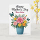 Esta tarjeta presenta un ramo fresco de rosas dispuestas sobre un fondo blanco brillante, creando un ambiente tranquilo y aireado. Una gran rosa suave de color rosa se encuentra cerca del centro, rodeada de botones amarillos y naranjas más pequeños, con hojas verdes y pequeñas flores sin abrir metidas entre ellos. Las flores descansan en una maceta de color teal con suaves crestas horizontales, lo que añade un toque relajado y hogareño que sugiere un regalo afectuoso destinado a alguien especial ❤️. Sobre el ramo, dos mariposas revolotean juntas, sus alas azul-verdosas inclinadas como si estuvieran compartiendo un momento de tranquilidad en el aire. Cerca de la parte superior, la línea principal de texto dice “Feliz Día de la Madre” en letra oscura de color carbón, con “Querida Hermana” colocada cerca en un tono rojo intenso para contrastar 🌼. Las palabras están colocadas sobre las flores con mucho espacio abierto, manteniendo la disposición fácil de leer sin abarrotar la ilustración. La iluminación suave y uniforme resalta las capas de los pétalos y la textura acanalada de la