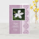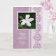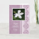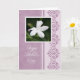 Tarjeta del día de madre en púrpura con una fotografía de una flor blanca del jardín y de un diseño elegante.