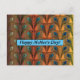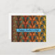 Tarjeta de saludo del día de la madre retro vintage con un diseño de plumas de pavo real en cálidos tonos dorados y turquesa.