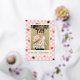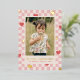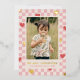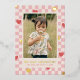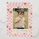 Una tarjeta del Día de San Valentín con foil y corazones rojos esparcidos sobre un diseño de cuadros rosados. El mensaje y la información del cliente se colocan debajo de una gran foto, y la parte posterior de la tarjeta presenta un patrón coordinado.