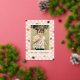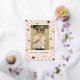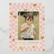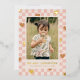Una tarjeta del Día de San Valentín con lámina metálica con corazones bronceados esparcidos sobre un diseño de tablero de ajedrez rosa. El mensaje y la información del cliente se colocan debajo de una gran foto, y la parte posterior de la tarjeta presenta un patrón coordinado.