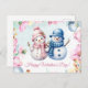 Una simple tarjeta del Día de San Valentín con una pareja de muñecos de nieve lindos (una niña y un niño) rodeados de flores rosadas de acuarela. Tema de invierno. Edite utilizando la Herramienta de Diseño para mover/redimensionar los elementos de este diseño y hacerlo suyo.