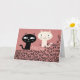 GATOS NEGROS Y BLANCOS MIRÁNDOSE, LA TARJETA TIENE FONDO ROSA Y LEE AMOR POR TODAS PARTES, Y TAMBIÉN MEOW UN PAR DE VECES. DENTRO DICE "AMOR A PRIMERA MEOW"